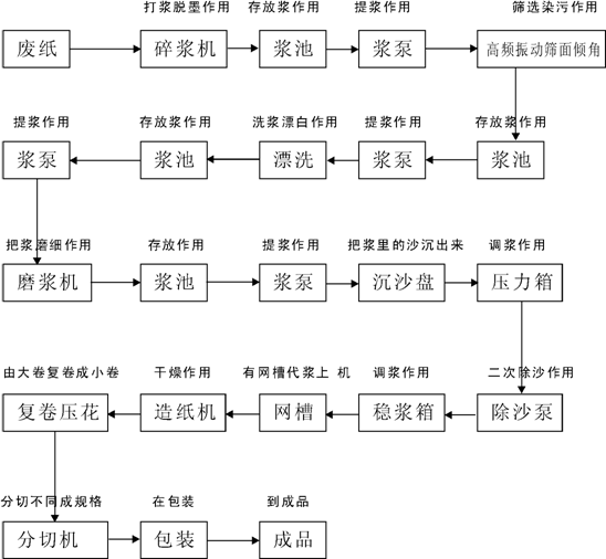 由廢紙進入水力碎漿機,水力碎漿機對廢紙進行作打漿脫墨,打漿脫墨后的紙漿流入漿池;由提漿泵把紙漿從漿池提入高頻振動篩,高頻振動篩起到篩選雜物分離作用;篩選后到流入漿池,再由漿泵提入漂洗機,作用是洗漿干凈,漂白;漂白后自動流入漿池;再由漿提入磨漿機,經(jīng)磨漿磨成細漿后,自動流入漿池再由漿泵提入沉沙盤,沉沙盤的作用是將沙灰等雜質(zhì)沉淀分離出去,后制成純漿,再由除沙泵提入穩(wěn)漿箱,穩(wěn)漿箱作用是調(diào)和漿的濃度,之后自動流入網(wǎng)槽后,由網(wǎng)籠毛毯帶漿進入烘缸。(烘缸是起烘干作用)后進入成品卷紙。卷紙后進入復卷機,復卷的作用是起復卷打孔壓花作用。由大卷復卷成小卷,后進入分切機,分切機的作用是起分切,不同規(guī)格長短作用,后經(jīng)包裝到成品。注:鍋爐是起到熱氣的作用,送入烘缸起到干燥紙的作用。